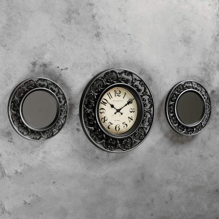 Часы 3в1 с зеркалом, двойной обод, римские цифры, ажурная резьба, серебристые, циф-т d=30 см