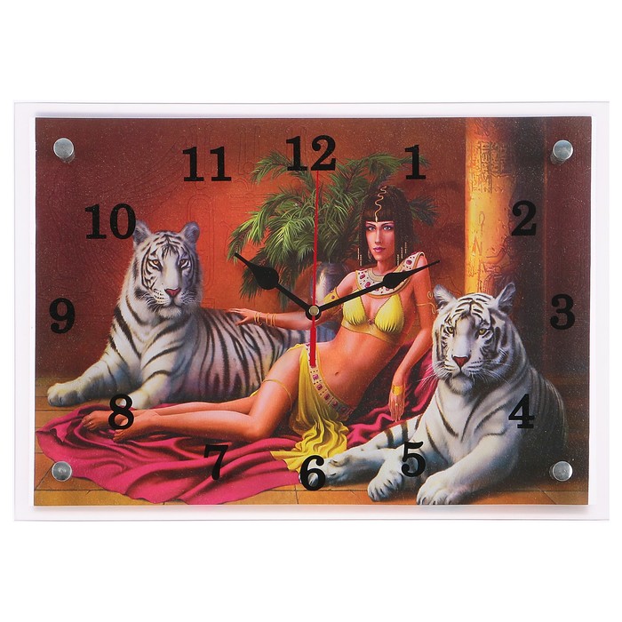 Каждому хозяину периодически приходит мысль обновить свою квартиру, сделать ремонт, перестановку или кардинально поменять внешний вид каждой комнаты. Часы настенные прямоугольные "Царица с тиграми", 25х35 см — привлекательная деталь, которая поможет воплотить вашу интерьерную идею, создать неповторимую атмосферу в вашем доме. Окружите себя приятными мелочами, пусть они радуют глаз и дарят гармонию.