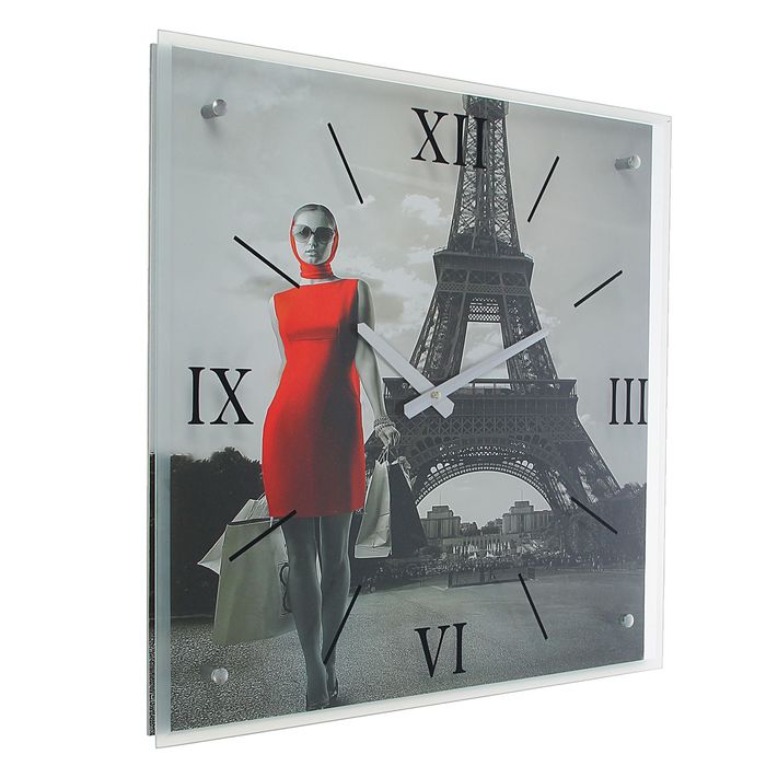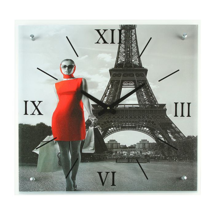 Часы настенные прямоугольные "Девушка в красном платье в Париже", 50х50 см