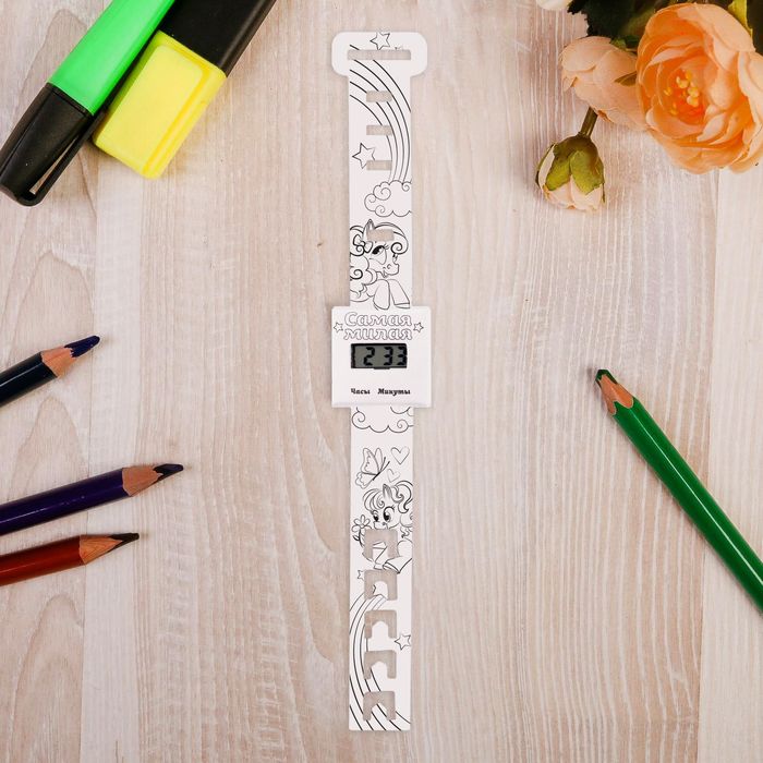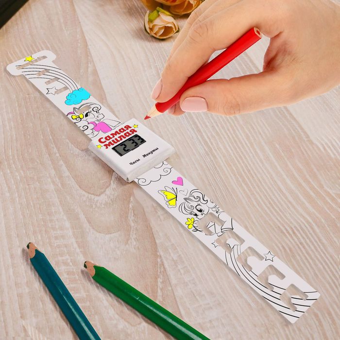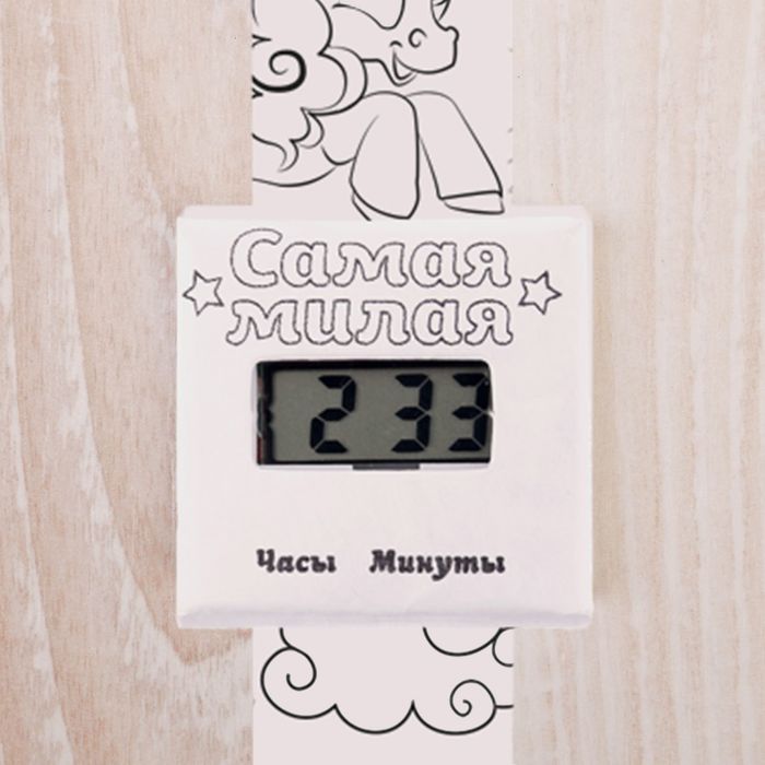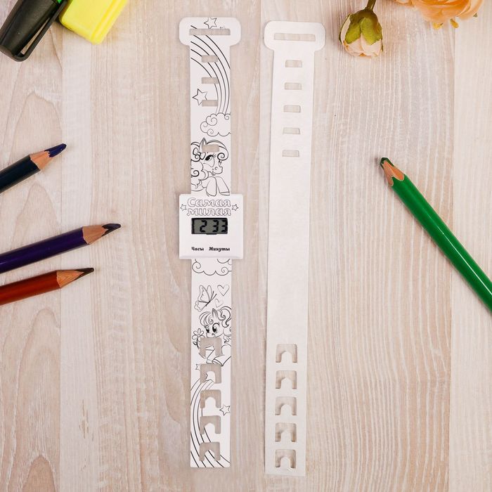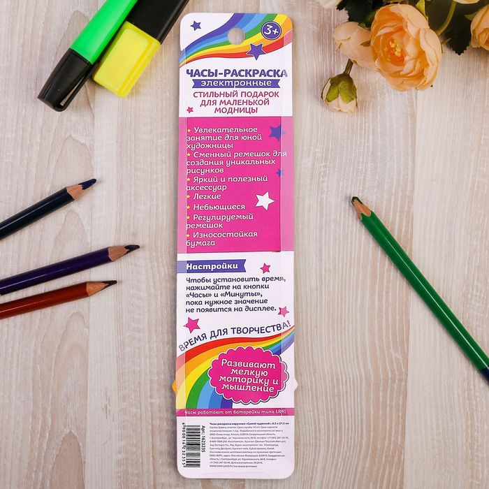 В набор входят 2 ремешка с рисунками и без. Раскрасив их, ребёнок создаст собственный дизайн часиков.