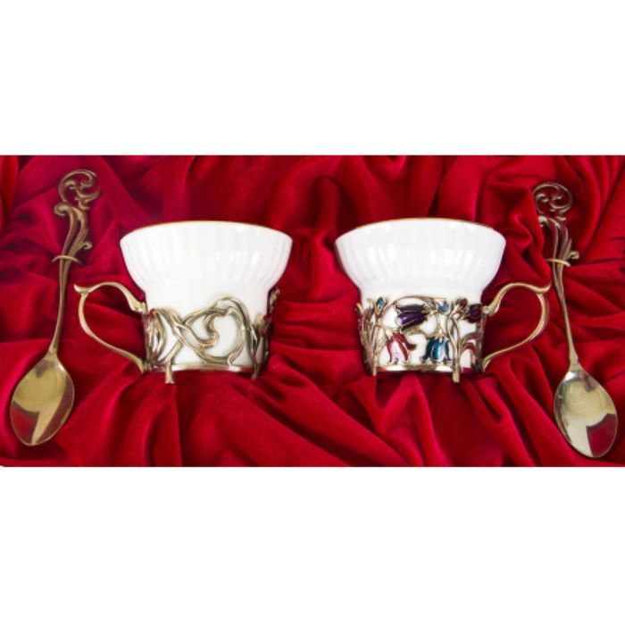 Чайная пара фарфоровая с цветками из латуни «Ирисы и Колокольчики» в шкатулке