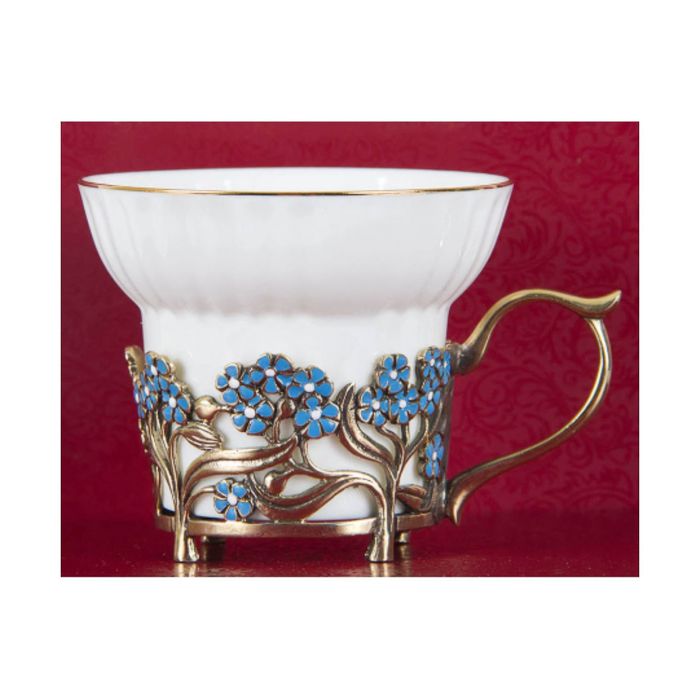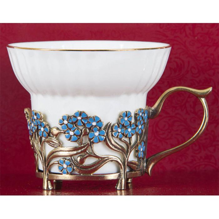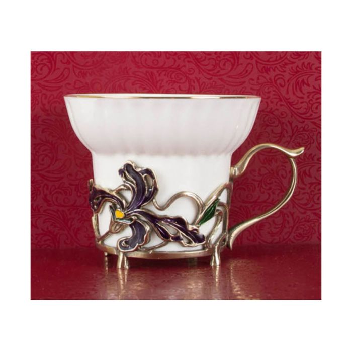 Чайная пара фарфоровая с цветками из латуни «Ирисы и Незабудки» в картонном футляре