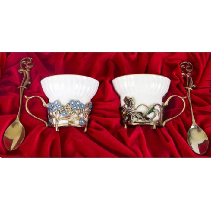 Чайная пара фарфоровая с цветками из латуни «Ирисы и Незабудки» в шкатулке