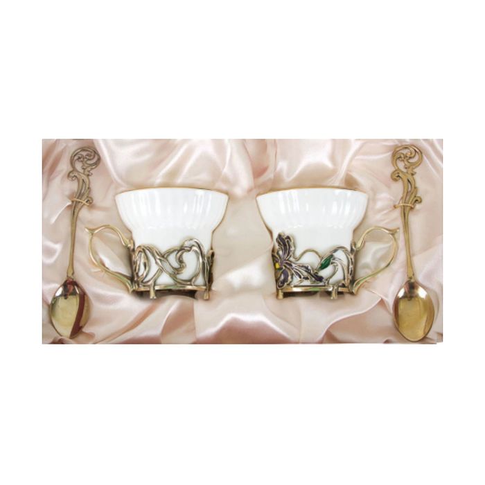 Чайная пара фарфоровая с цветками из латуни «Ирисы» в картонном футляре
