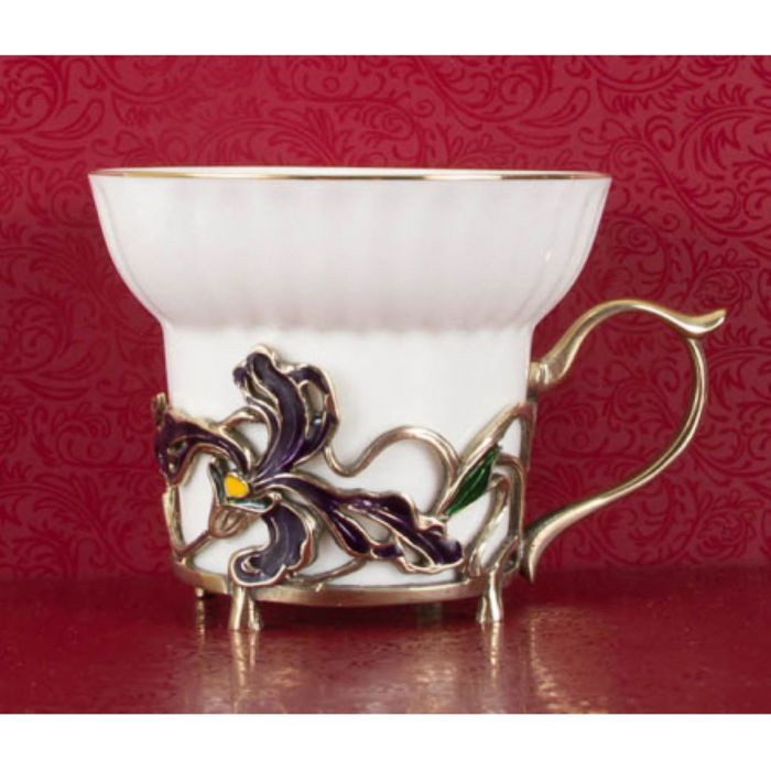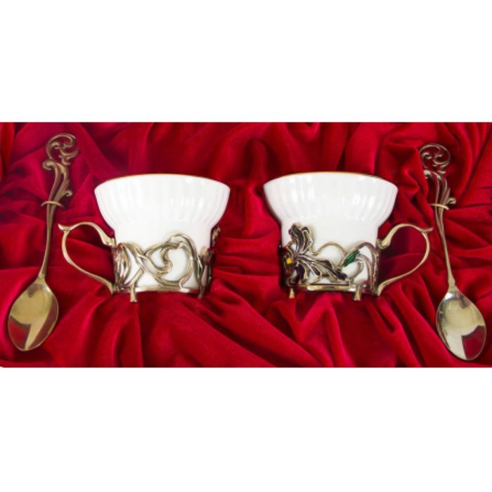 Чайная пара фарфоровая с цветками из латуни «Ирисы» в шкатулке