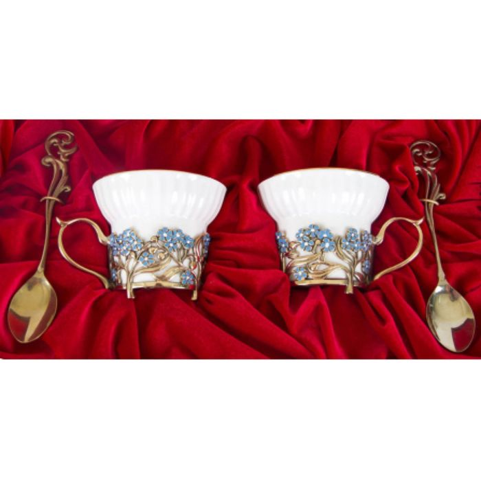 Чайная пара фарфоровая с цветками из латуни «Незабудки» в шкатулке