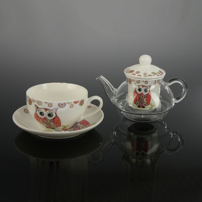 Чайник 330 мл заварочный стеклянный с керамическим ситом, чашкой 200 мл и блюдцем "Мечтающая сова"