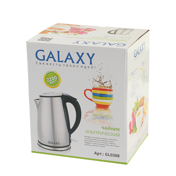 Чайник электрич. Galaxy GL 0308, 2200 Вт, 1.8 л, метал. корпус, съемный фильтр, автооткл. — полезный бытовой прибор на любой кухне. Данная модель изготовлена из термостойких материалов, которые надолго сохраняют первозданный внешний вид. Особая конструкция гарантирует твёрдое положение прибора на различных поверхностях. Оптимальные объём и мощность обеспечивают быстрое закипание воды.