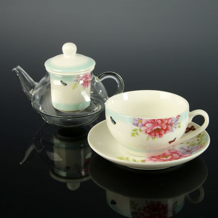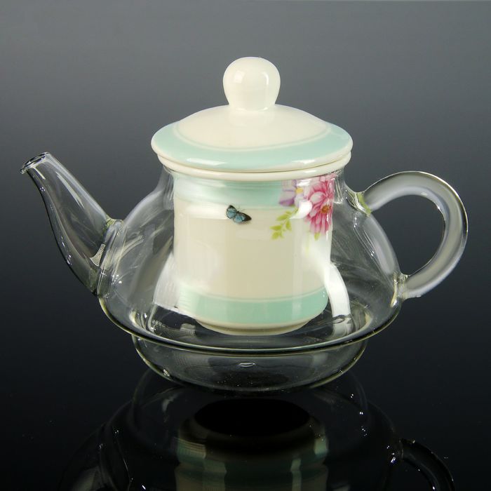 Сделать чаепитие с близким человеком ещё приятнее поможет элегантная посуда. Данный чайный набор — нежное сочетание стекла и керамики, он украсит любой стол во время очередной встречи или праздничного застолья. Благодаря гармоничной комбинации цветов посуда удачно дополнит кухонный интерьер. В классическом чайнике вы сможете заварить ароматный напиток, который придаст энергии на весь день.