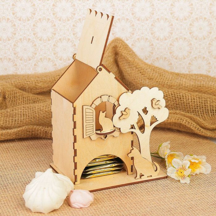 Чайный домик из фанеры "Сад-2 с кошкой и собакой" 17х17 см