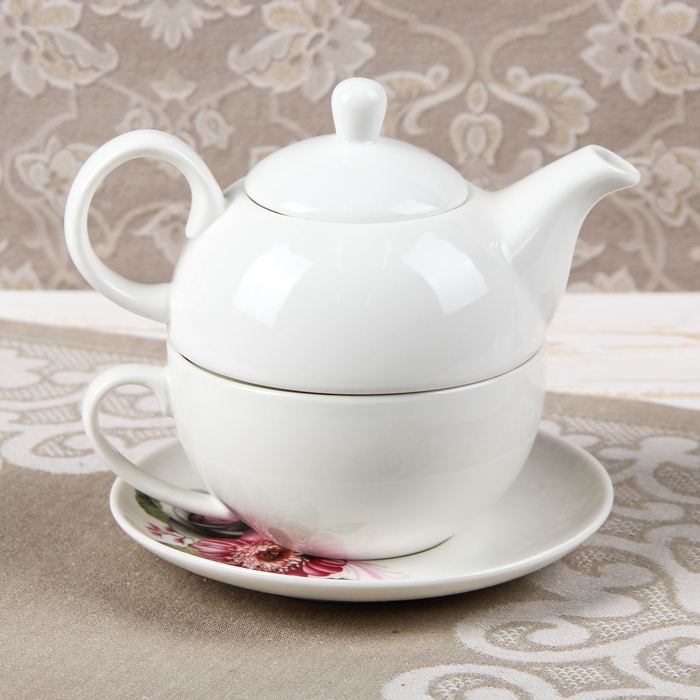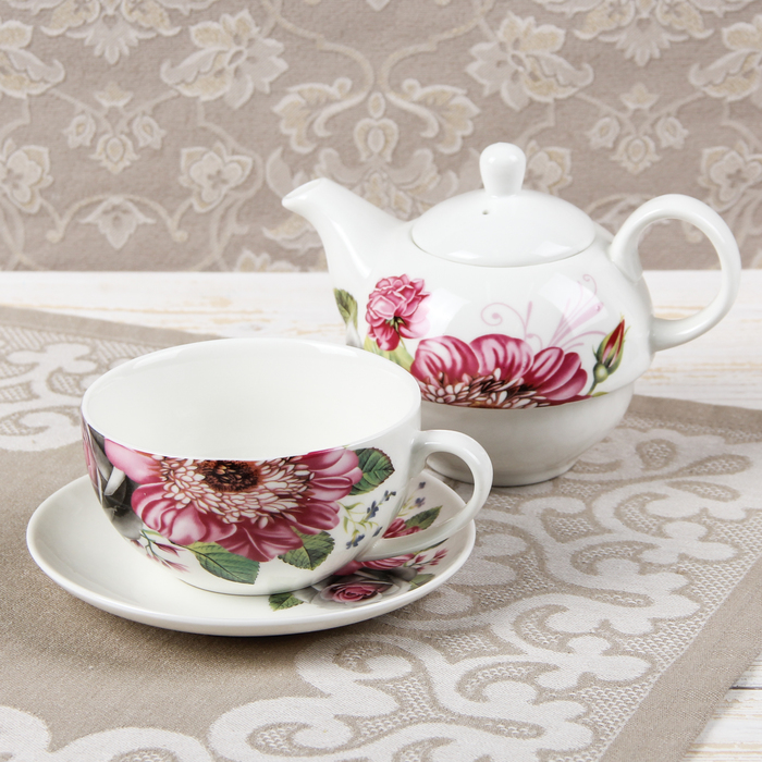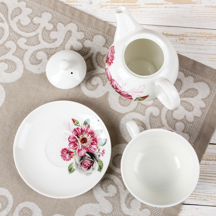 Чайный набор "Розовые цветы", 3 предмета: чайник 500 мл, чашка 11 см 300 мл, блюдце