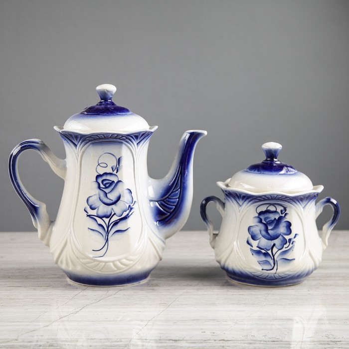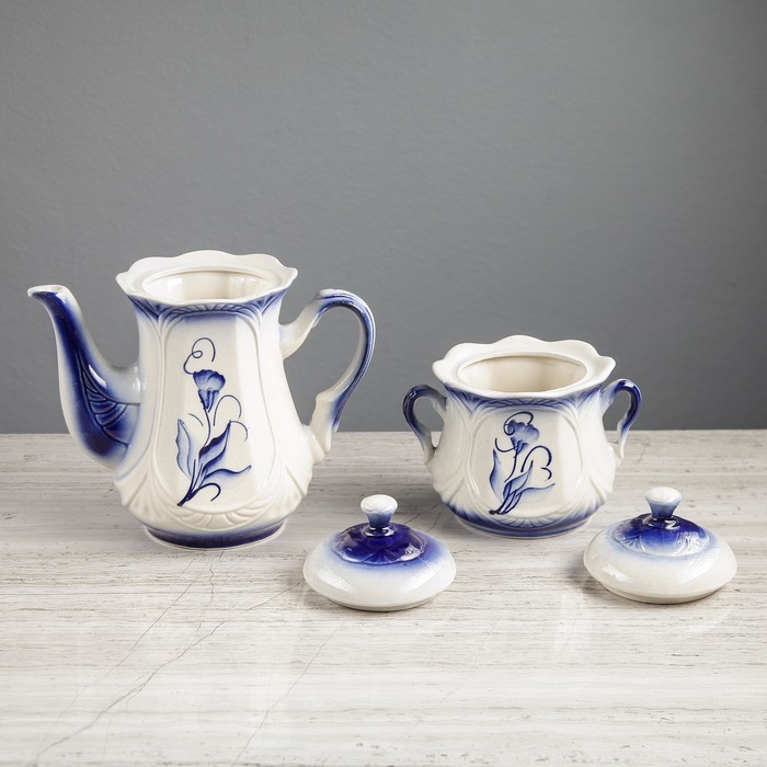 Чайный сервиз "Ажур" гжель, 8 предметов: сахарница, чайник 1 л, 6 кружек 0,22 л