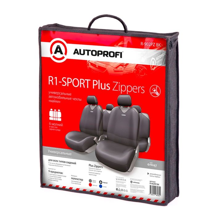Чехол-майка AUTOPROFI R-1 SPORT PLUS Zippers R-902PZ BK, закрытое сиденье, полиэстер, 9 предметов, 6 молний, цвет чёрный