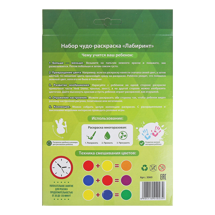 «Чудо-раскраска» — это цветные поролоновые фигурки, которые ребёнку предстоит разрисовать пальчиковыми красками. Используйте элементы как штампики для создания картинок или дайте им высохнуть и устройте с малышом спектакль. Изделия многоразовые, что позволит ребёнку раскрасить их снова после стирки.