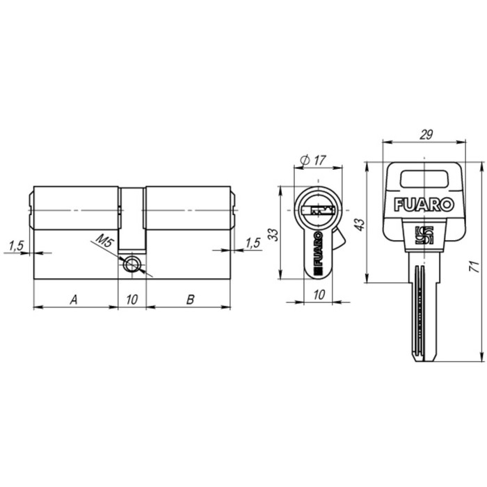 Цилиндровый механизм Fuaro D500/60 (25х10х25) PB, 5 ключей, цвет латунь