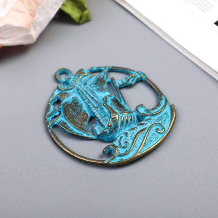 Декор металл для творчества "Корабль по волнам" зелёная патина 4х4,3 см