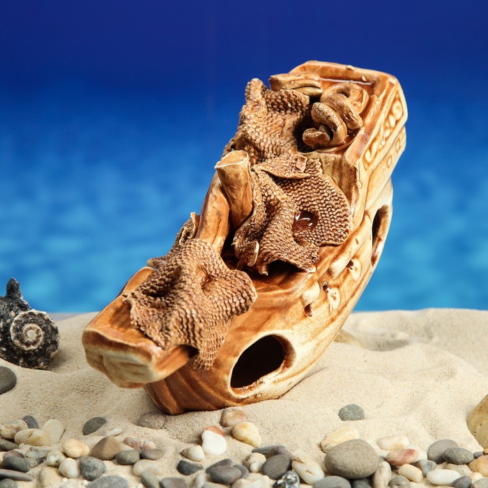 Декорация устойчива к воздействию температуры и подходит для пресной и морской воды. В изделии есть множество отверстий, в которых смогут укрываться мелкие рыбки.