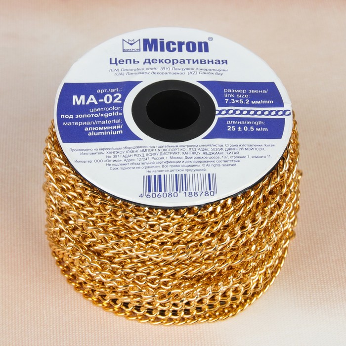 Декоративная цепочка, 7,3*5,2мм, 25±0,5м, цвет золотой