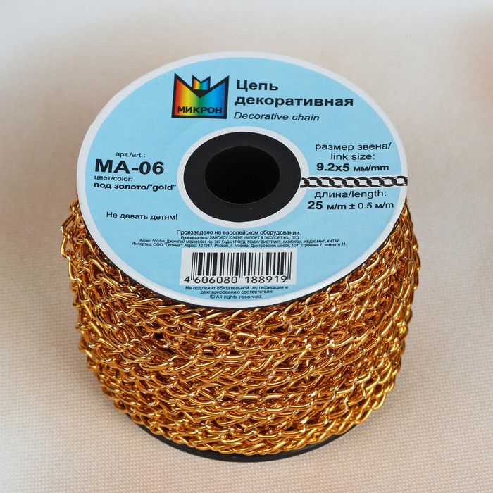 Декоративная цепочка, 9,2*5мм, 25±0,5м, цвет золотой