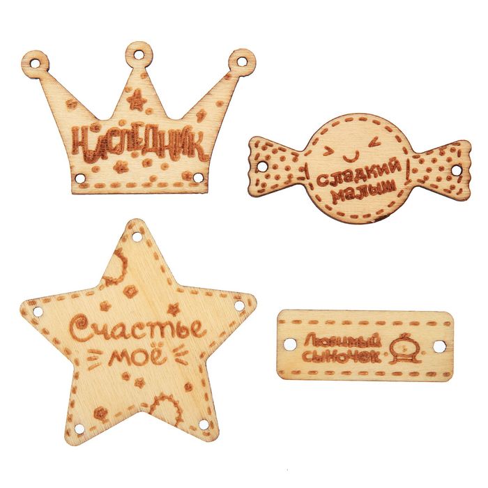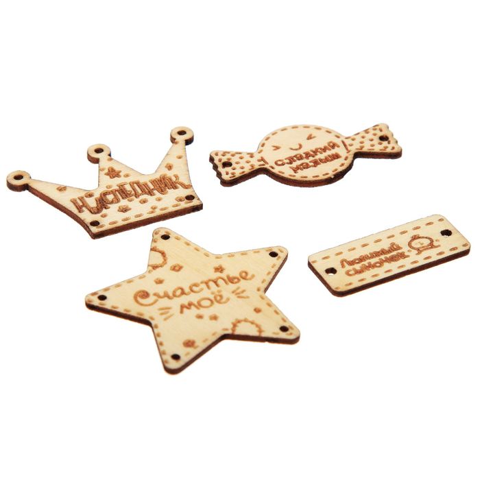 Данные декоративные нашивки — это небольшие деревянные фигурки, которые пригодятся при оформлении изделий ручной работы: игрушек, картин, альбомов, фоторамок, панно, коллажей и других. Разрисуйте их акриловыми красками или используйте в натуральном виде. Элементы можно пришить нитками или прикрепить с помощью лент.
