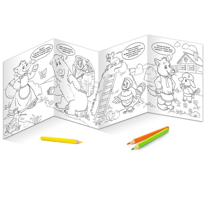 Раскраска имеет уникальный формат. Откройте первую страницу и разверните длинную сказочную историю, ведь поле для рисования составляет целых 90 сантиметров в длину. Благодаря чёткой контурной линии малютка не зайдёт за края рисунка.