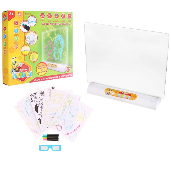 3D-очки, 4 цветных маркера, 12 картинок для обводки, подставка со световым эффектом, прозрачная доска для рисования.