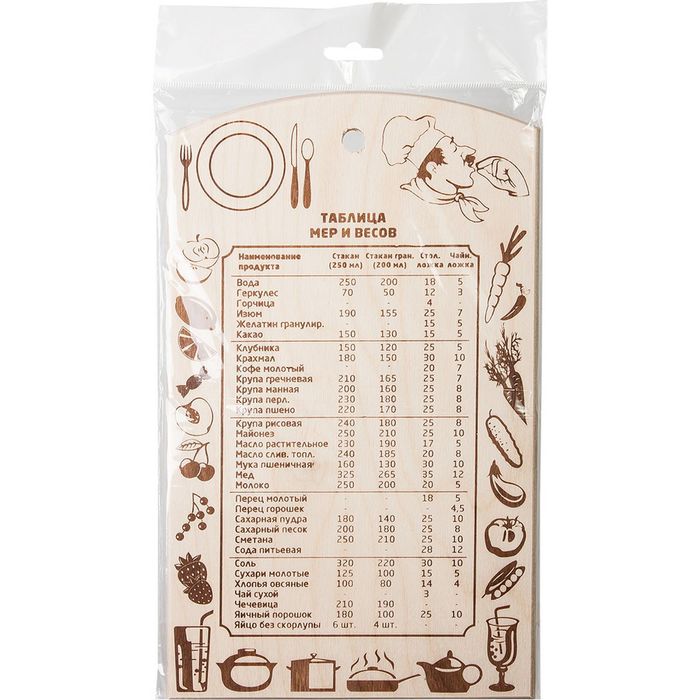 От качества посуды зависит не только вкус еды, но и здоровье человека. Доска разделочная "Таблица мер и весов" — товар, соответствующий российским стандартам качества. Любой хозяйке будет приятно держать его в руках. С нашей посудой и кухонной утварью приготовление еды и сервировка стола превратятся в настоящий праздник.