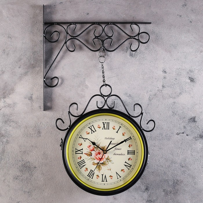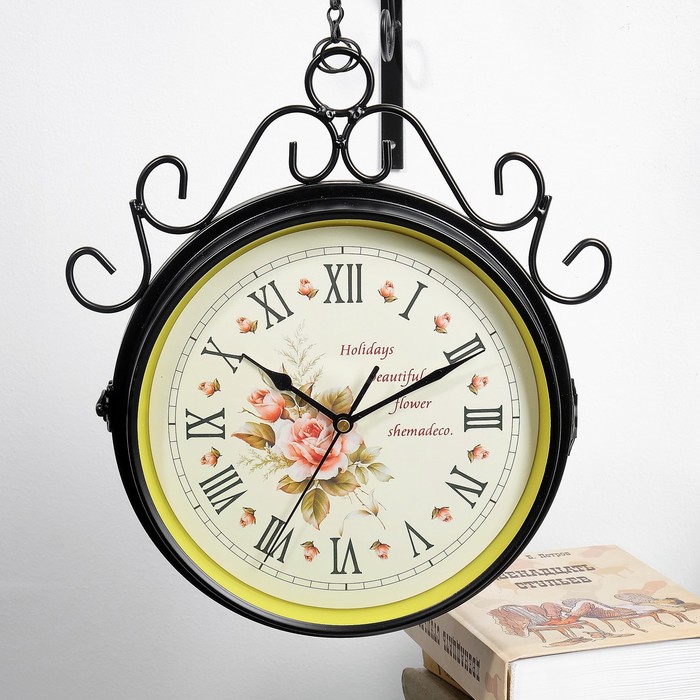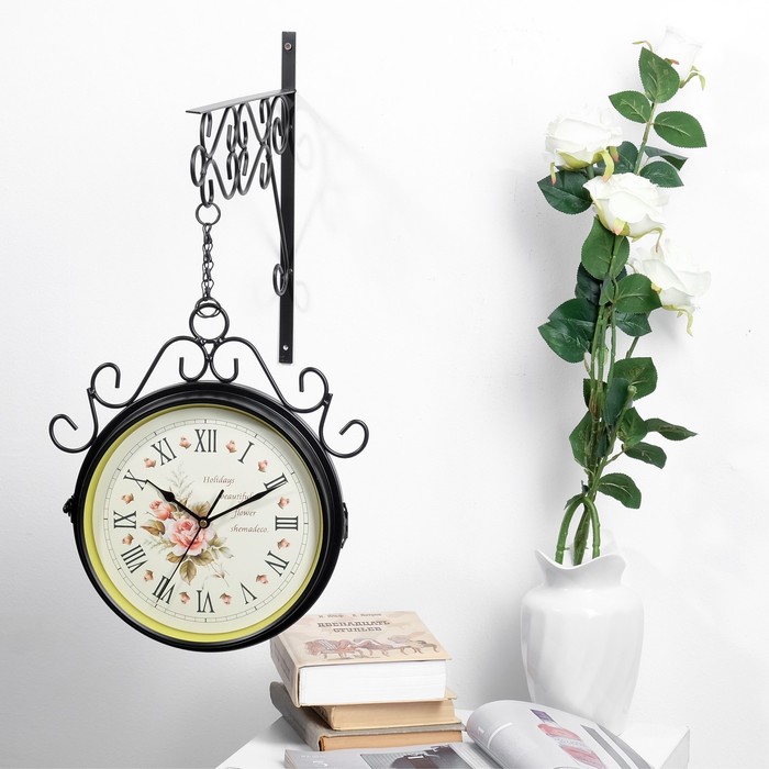 Двойные настенные часы черные , на цепях, круглые,цветы на циферблате, 35*9*53 см
