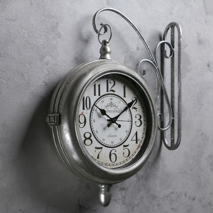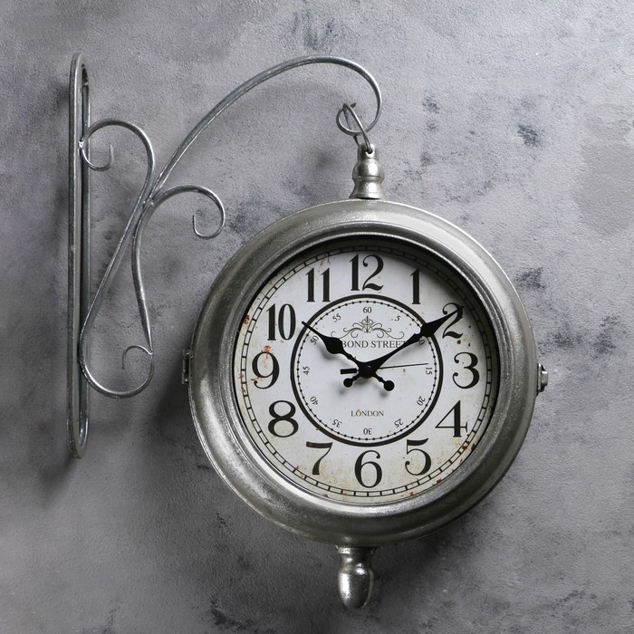 Двойные настенные часы, купол снизу, цвет потёртое серебро, d=24 см, 45х37 см