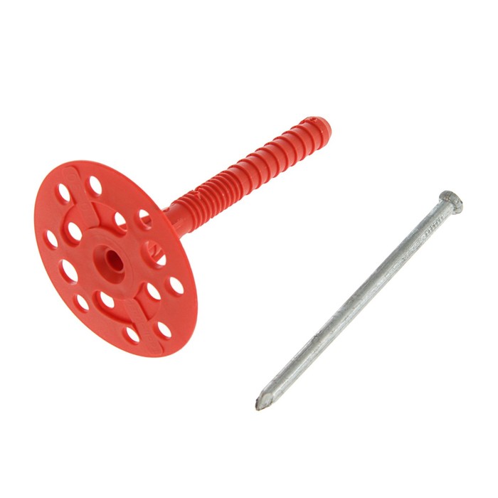 С помощью дюбеля с металлическим гвоздём вы закрепите все типы теплоизоляционных материалов. Изделие обладает высокой степенью жёсткости благодаря наличию специальных рёбер в месте соединения пластикового стержня и шляпки.