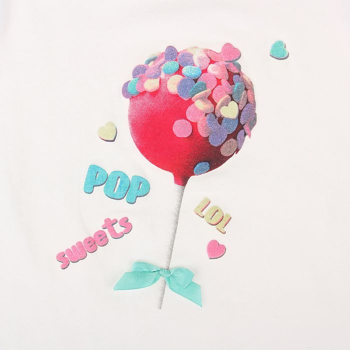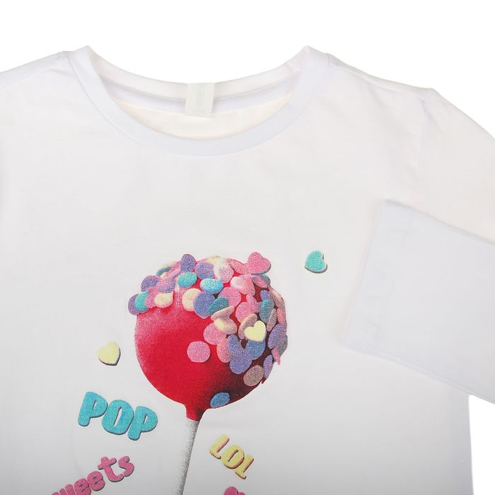 Джемпер детский для девочек Fruity, рост 146 см, цвет белый (арт. 20210100006) отличается дизайном «как у взрослых»: трикотажный лонгслив декорирован ярким принтом с надписями и атласным бантом, что выглядит здорово!