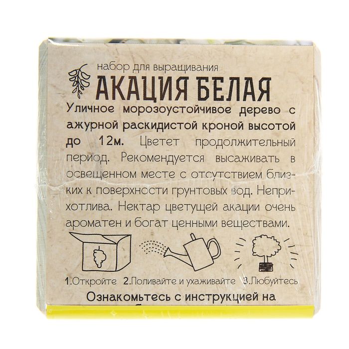 Знакомьтесь, это экокуб. С ним вы сможете наблюдать, как растёт белая акация: от маленького семечка до взрослого дерева с цветочками и плодами. А когда растение чуть окрепнет, его можно пересадить в открытый грунт.