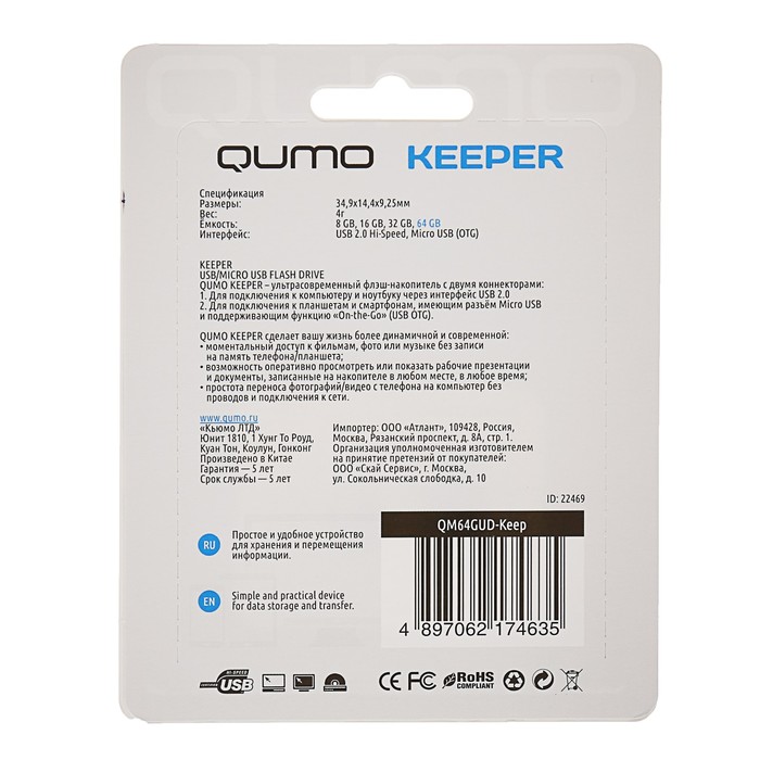 Флешка USB OTG Qumo Keeper 64 Гб подойдёт для тех, кому необходимо иметь съёмный носитель для хранения и перемещения данных различных форматов.