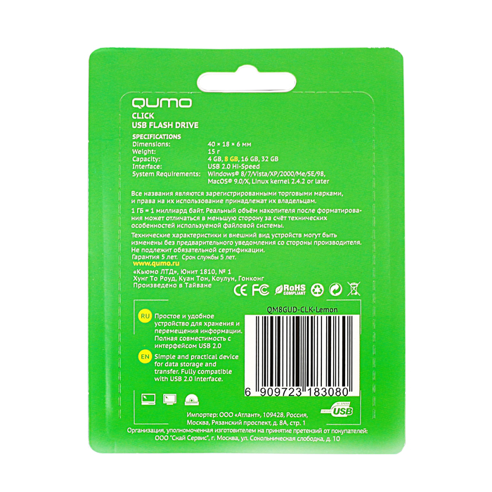 Флешка USB QUMO 8GB Click Lemon, жёлтая подойдёт для тех, кому необходимо иметь съёмный носитель для хранения и перемещения данных различных форматов.