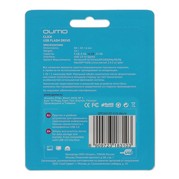 Флешка USB Qumo Click 16 Гб, цвет лазурь подойдёт для тех, кому необходимо иметь съёмный носитель для хранения и перемещения данных различных форматов.