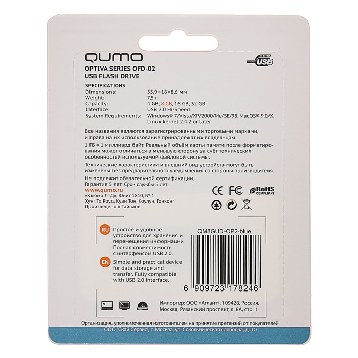 Флешка USB Qumo Optiva 02 8 Гб, синяя