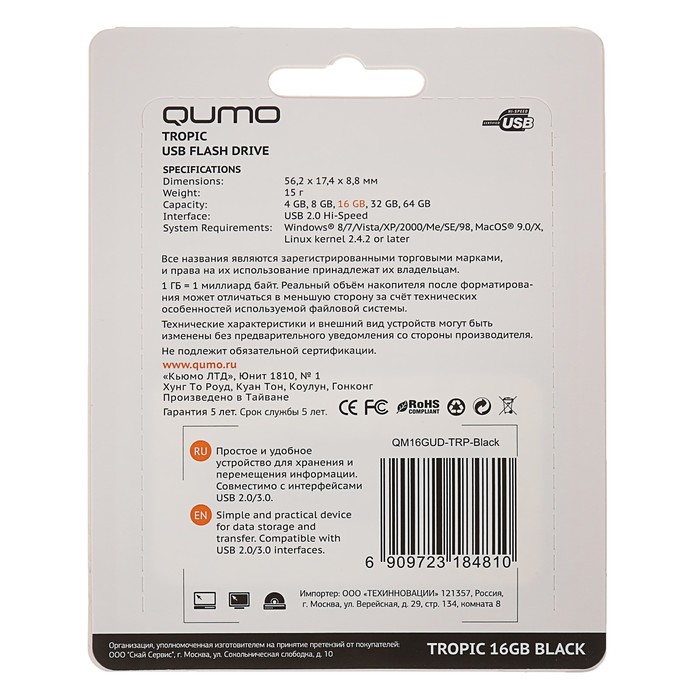 Флешка USB Qumo Tropic 16 Гб, черная подойдёт для тех, кому необходимо иметь съёмный носитель для хранения и перемещения данных различных форматов.
