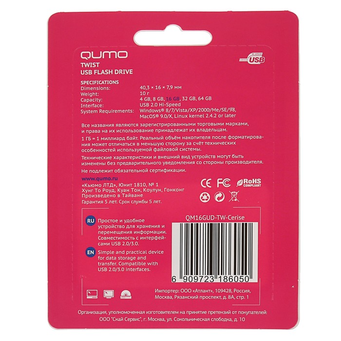 Флешка USB Qumo Twist 16 Гб, светло-вишневая подойдёт для тех, кому необходимо иметь съёмный носитель для хранения и перемещения данных различных форматов.