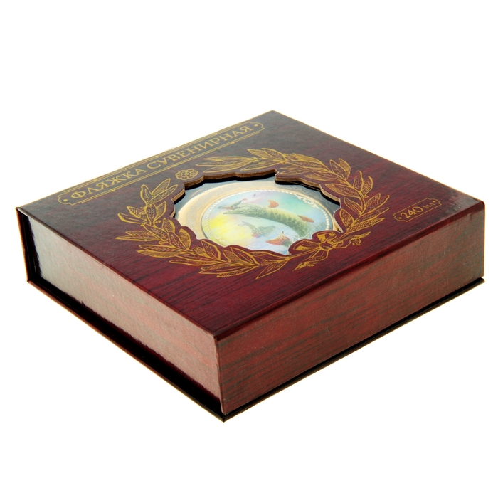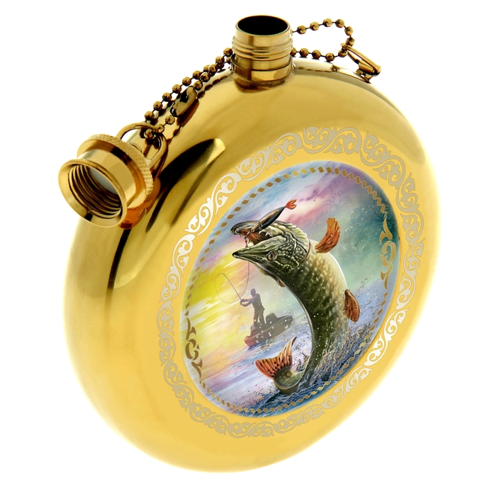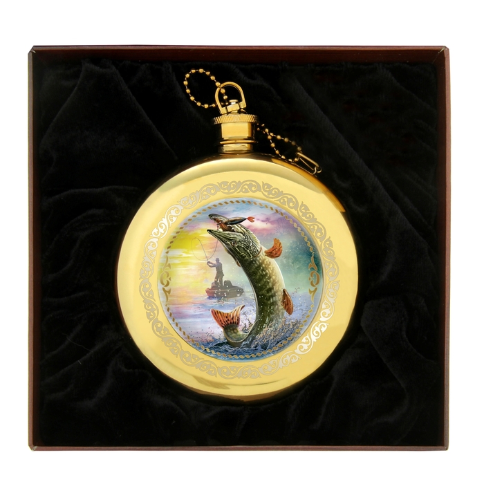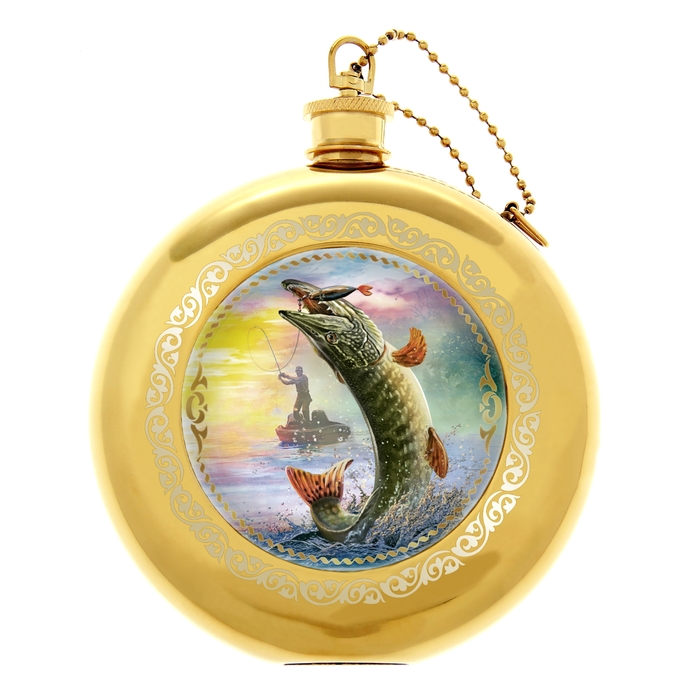 Фляжка "Рыбалка.Щука" 240 мл - эксклюзивный презент в подарочной упаковке, выполненный в торжественном стиле. В центре изделия – оригинальное изображение в стиле русской живописи с яркими красками и выразительными высказываниями, придающее аксессуару неповторимый роскошный вид. Специальное плоское дно позволяет использовать фляжку не только по её прямому назначению - как емкость, но и как прекрасный сувенир, украшающий сувенир. Крышка фляжки прикреплена специальной цепочкой, для избежания потери во время эксплуатации.