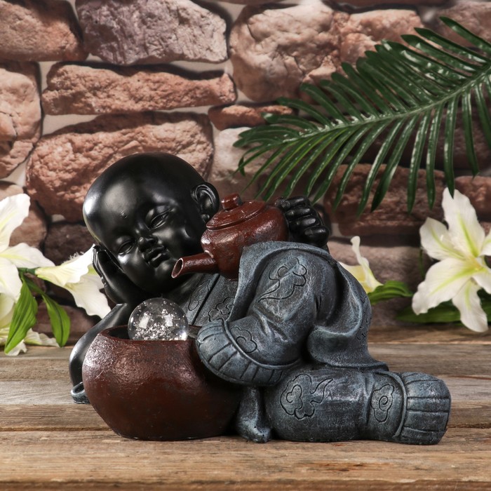 Фонтан настольный полистоун свет "Маленький Будда и чайная церемония" 21х27х26 см