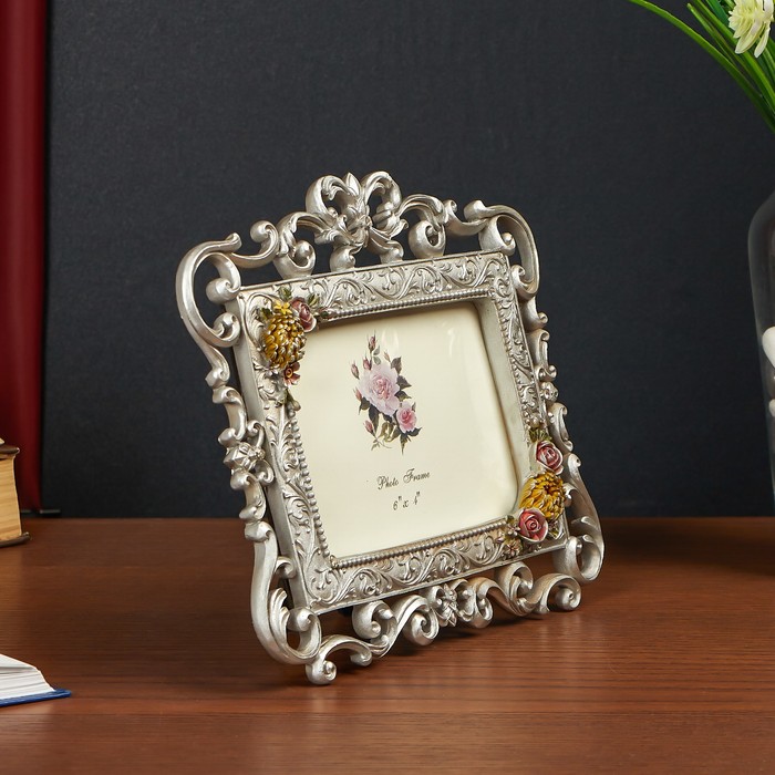 Фоторамка полистоун 10х15 см "Валенсия" стразы серебристая с розами 18,5х21 см