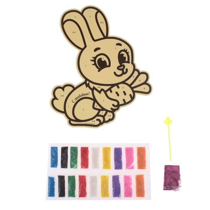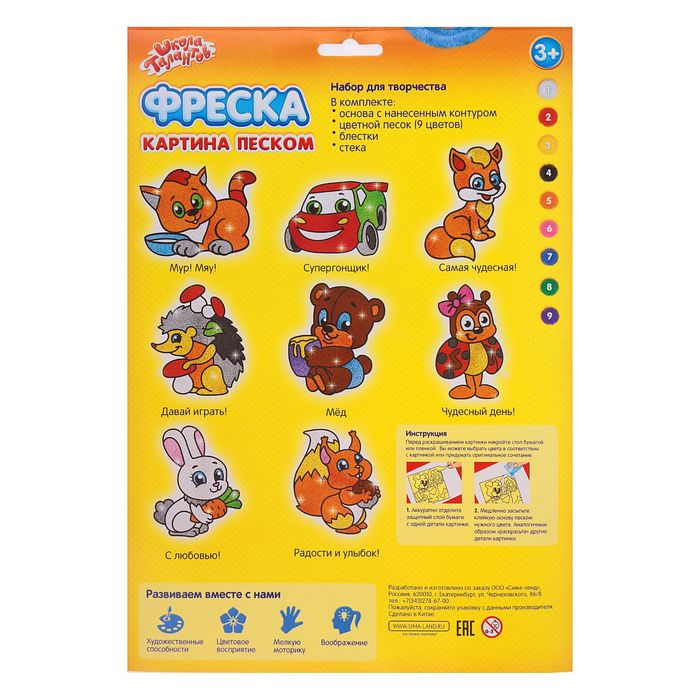 Фреска песком — увлекательный вид творчества, который понравится каждому ребёнку. Клеевая основа защищена специальным слоем бумаги, куда нанесены прорезные контуры. Каждый цвет находится в своей зоне: отделяйте верхний слой с помощью стеки, засыпайте песком подходящего оттенка и добавляйте блёстки. Специальные контуры не дадут разноцветным частичкам перемешаться и помогут создать сверкающий шедевр.