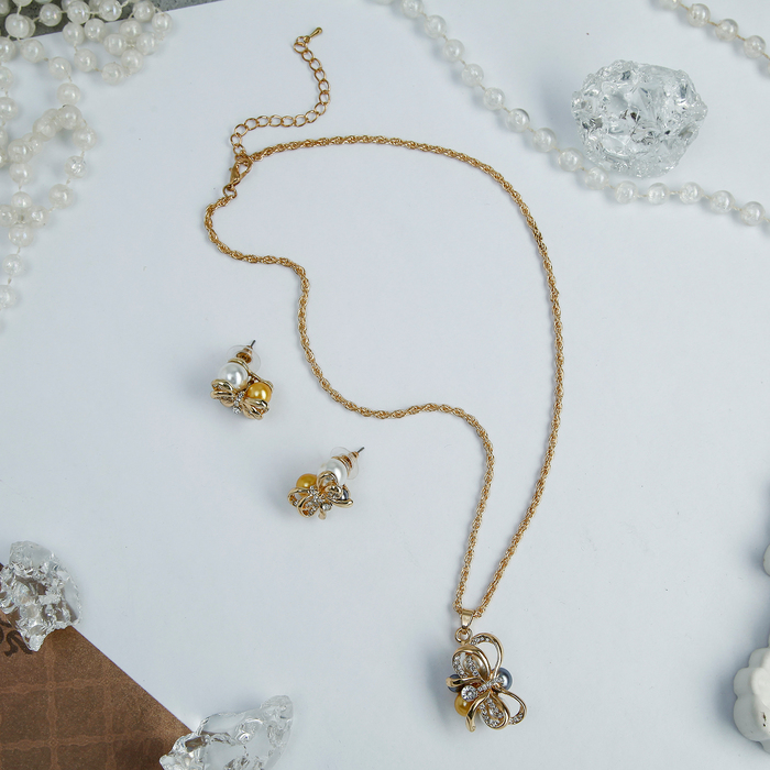 Ни один стиляга не будет выглядеть современно без искусно подобранных украшений, которые завершат его образ! Бижутерия — это современная недорогая альтернатива изделиям из золота и прочих драгоценных металлов. Гарнитур 2 предмета: серьги, кулон "Бант", цветной в золоте, 45см — это то, что добавит вам шарма!