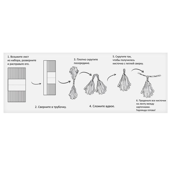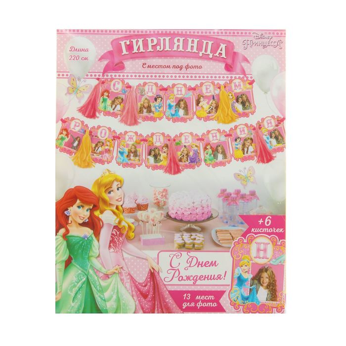 Изделие состоит из 13 флажков (место под фото 8 × 8 см) с односторонней печатью и 6 ярких кисточек. Повесьте аксессуар, привязав его или прикрепив к стене с помощью клейкой ленты или кнопок.