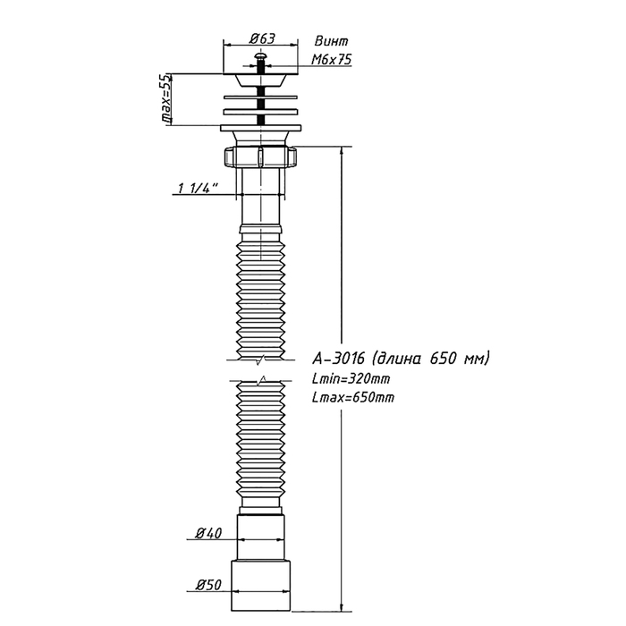 Гофра труба ORIO A3016, 1 1/4"х40/50 L 320-650 мм, с выпуском