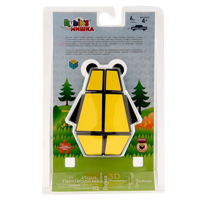 «Мишка Рубика» — детская версия легендарной головоломки. Она выполнена в формате 3×2×1 и является самой простой в серии. Для знакомства с головоломкой достаточно собрать мишку другой формы и с несовпадающими цветами. После полного её освоения предложите малышу более сложные версии. Детский кубик имеет все особенности классической головоломки: высококачественное литьё деталей, запатентованный механизм и пластиковые цветные вставки вместо наклеек.