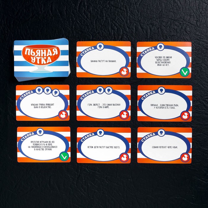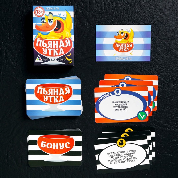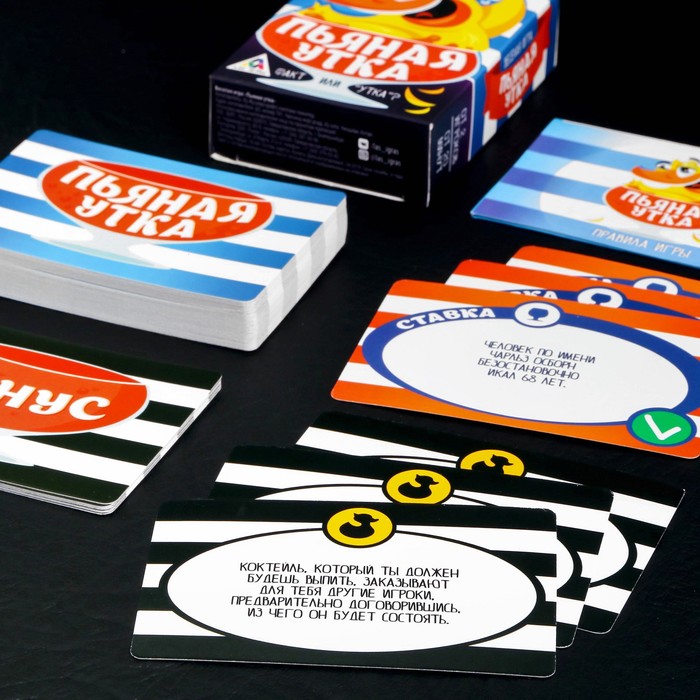 Разделите карточки на 2 колоды: «Пьяная утка» и «Бонус». Вытягивайте карточки, зачитывайте факт, который на них написан, а затем озвучивайте ставку — именно столько игроку нужно будет выпить в случае неправильного ответа. Если участник оказался прав, то штрафную выпивает тот, кто читал вопрос. Ошибся — пьёт сам! Ну а в случае, когда вы играете в баре, — вытягивайте бонусы и выполняйте задания.