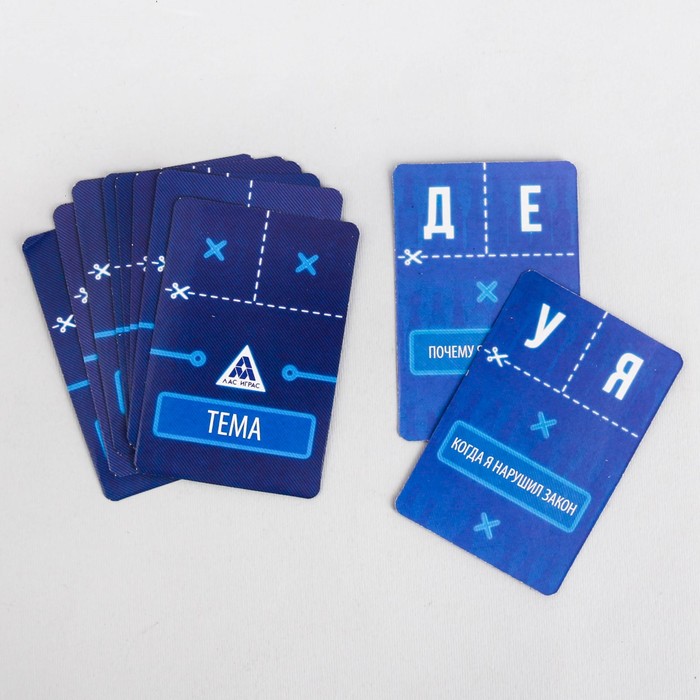 Разрежьте карточки по пунктиру и разделите на две колоды. Первый игрок тянет карточку из стопки «Тема» и зачитывает её вслух. Любой другой участник вытягивает карту из колоды «Буква», первому игроку эту букву показывать нельзя, а остальным нужно продемонстрировать обязательно.