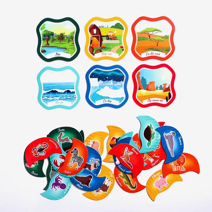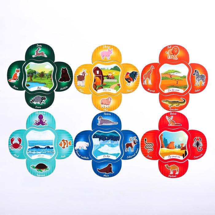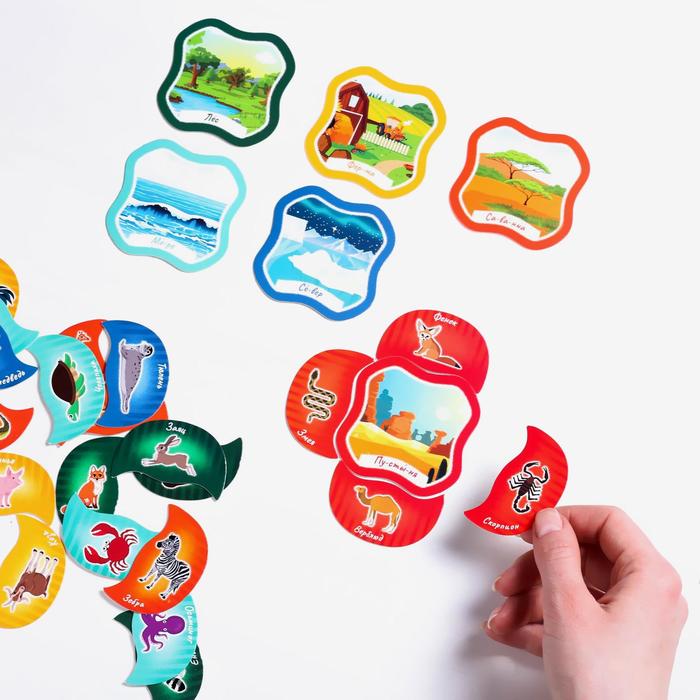 В наборе вы найдёте карточки, которые помогут малышу научиться строить логические цепочки и объединять предметы по определённому признаку. Например, группировать тех животных, которые обитают в воде, и тех, что живут в пустыне или в лесу.