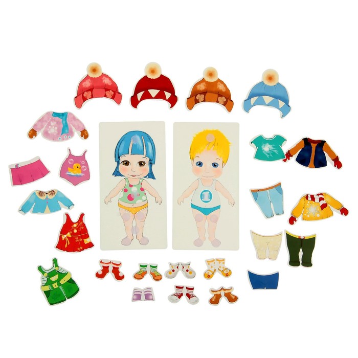В наборе представлено по 4 комплекта одежды для мальчика и девочки — по 2 для тёплых времён года и по 2 для холодных. Игрокам необходимо раздать карточки-образцы героев, внешний вид которых будет служить примером для участников. Их задача — одеть своего персонажа аналогичным образом.